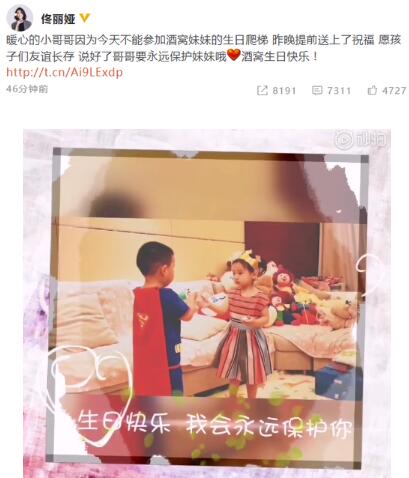 6月2日,佟丽娅和大家分享了自己儿子朵朵为董璇女儿小酒窝庆生的录像,视频中朵朵穿着超人的衣服,向穿着公主服的小酒窝特别男子汉地保证道:“生日快乐,我会永远保护你!”两个人最后还热情地抱在一块儿,看起来感情是特别的好,佟丽娅还解释了事情的缘由,暖心祝福酒窝:“暖心的小哥哥因为今天不能参加酒窝妹妹的生日爬梯,昨晚提前送上了祝福,愿孩子们友谊长存。说好了哥哥要永远保护妹妹哦,酒窝生日快乐!”