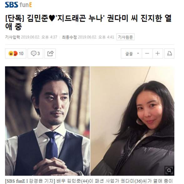 6月2日,根据SBSfunE报道,演员金敏俊与歌手GD的姐姐时尚企业家权多美正在以结婚为前提进行真挚的交往,据悉两人生活风格和在艺术方面的见解都非常合拍,计划将于今年10月份结婚。两人平时和许多普通的情侣一样在首尔汉南洞,清潭洞一带大方享受约会。