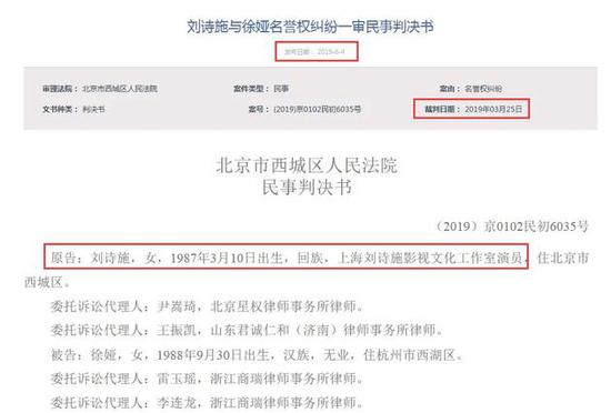 6月4日,北京法院审判信息网公开了刘诗诗与徐娅名誉权纠纷一审判决书。从判决书中可以看到,系被告徐娅通过微博账号“痴汉少女小奶猪”发表了多则造谣刘诗诗不孕不育等恶劣谣言的信息,被