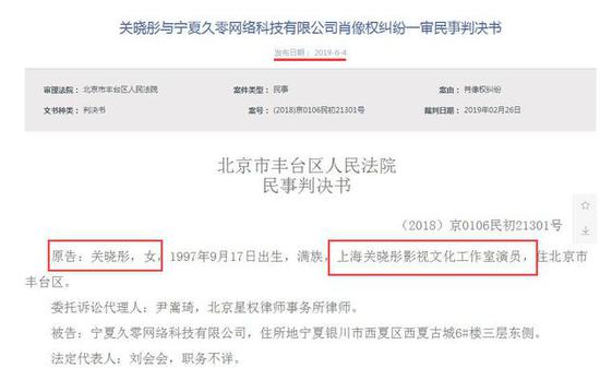 6月4日,北京法院审判信息网公开了发布了关晓彤与宁夏某公司肖像权纠纷一审民事判决书,关晓彤一审胜诉。从判决书中可以看出,被告在网上发布一篇《天呐!林妙可浓妆似大妈,关晓彤同样都是16岁怎么差别这么大》的文章,擅自使用关晓彤6张照片进行商业宣传,吸引浏览者来达到其美妆项目宣传的目的。法院认定被告侵犯关晓彤肖像权,判定被告三日内删除侵权文章,刊登道歉声明不少于一个月,并赔偿关晓彤经济损失3万元。