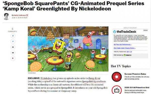 6月5日,据外媒报道,美国儿童动画《海绵宝宝》将拍前传。Nickelodeon宣布了一部该动画剧前传性质的剧集,工作标题为《Kamp Koral》,这也是《海绵宝宝》角色首次拍衍生剧。
