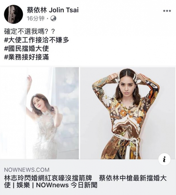 6月6日,林志玲闪电公布婚讯,娱乐圈大龄未婚女神又少了一位,而蔡依林有望成为最新挡婚大使。蔡依林知道后也通过社交平台自我调侃道:“确定不选我吗?大使工作接洽不嫌多,国民挡婚大使,业务接好接