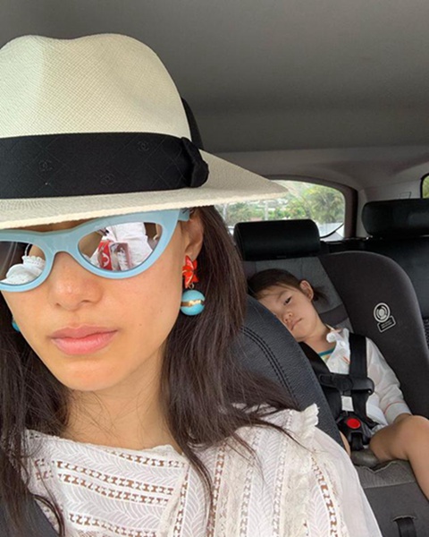 近日,秦舒培在个人社交网站上晒出一张自己与女儿在车内的合照,照片中,秦舒培头戴草帽,身穿白衣面戴蓝色墨镜半遮脸部,配蓝色耳环炫酷十足,女儿Alaia扎小辫靠坐在后排的儿童座椅上犯困,神情慵懒呆萌可爱。陈冠希则在下方评论到:“QUEEN”。