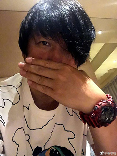 6月10日晚,潘粤明晒出自拍照,并和网友互动称:“上海,晚安……”照片中,潘粤明身穿卡通图案的白色T恤,一头长发,刘海盖住眼睛,一只手捂住鼻子和嘴巴