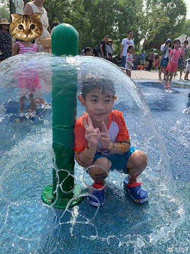 照片中,小鱼儿在欢快地玩着水,还时不时的对镜比耶,造型搞怪秒变表情包。