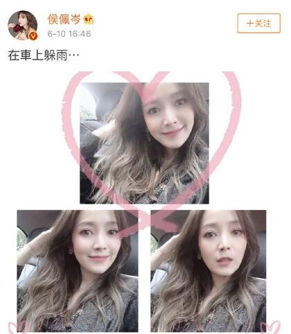 据香港媒体报道,好多女艺人拥有纯熟的自拍技巧,甚至在任何场合、时间、天气都可以拍出萌爆的美照,台湾女星侯佩岑就是一个好例子,她近日在微博晒出了三张在车里的自拍照片,照片中她利用低角度,令自己的面形显得