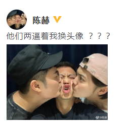 6月12日晚,陈赫鹿晗邓超三人分别晒出同一张照片,并逗趣写道:“他们两逼着我换头像”照片中,陈赫闭着双眼,一手抓住邓超的脖子并亲吻邓超,另一边的鹿晗也是瞪着双眼死劲的将嘴巴凑近
