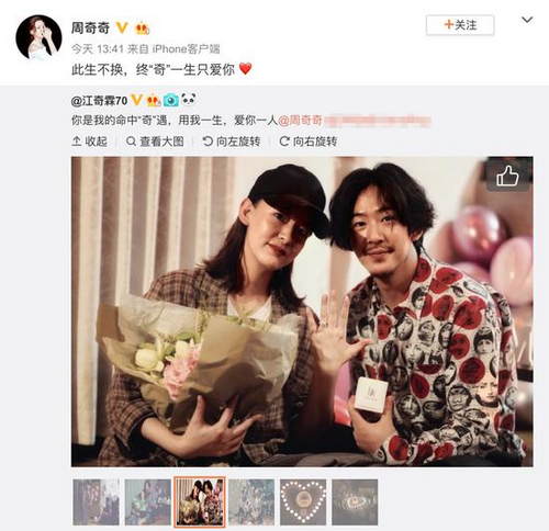 6月14日,江奇霖发布了一组求婚照片,照片里他向周奇奇求婚,两人甜蜜合影,并配文“你是我的命中奇遇,用我一生,爱你一人”,随后周奇奇也转发条微博,配文“此生不换,终‘奇’一生只爱你”。