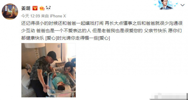 6月16日中午,姜潮晒出父母与儿子的同框照,回忆着小时候与爸爸的打闹的时光,向父亲表达爱意送上祝福称:“父亲节快乐, 愿你们都健康快乐 ,时光请你走得慢一些。”其妻子麦迪娜评论称:“祝宝宝第一个父亲节快乐”。