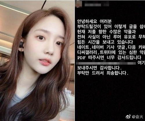 近日,韩瑞熙发文表示”现在因为无数的恶意留言和毫无事实根据的谣言散布,我度过了非常艰难的时期,如果能将在社交网站看到的相关言论PDF摘下,真的非常感谢了。”