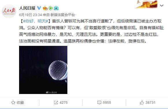 北青网娱乐讯 19日,人民日报针对曾轶可事件再发文:音乐人曾轶可为其不当言行道歉了,但后续商演已被主办方取消。公众人物能否有情绪?可以有,但“敢爱敢恨”也得先有是非观。自身有错