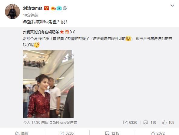 6月20日,刘涛现身石家庄出席某品牌活动,一身红色状态很好。有粉丝拍下了活动美照,并喊话刘涛:“刘那个涛 瘦也瘦了白也白了抠脚也抠够了 那考不考虑进进组拍拍戏了呢”刘涛转发了这条内容,回复道:“希望我演哪种角色?说!”