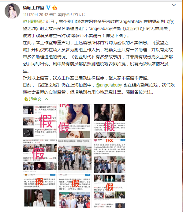 11月29日,杨颖工作室针对近日网络上出现的“Angelababy拍摄新剧《欲望之城》无故带多名助理进组”“Angelababy拍摄《创业时代》无故消失使对手戏演员和空气对戏”等传言进行了澄清:“本工作室郑重声明,上述信息所称内容均为虚假的不实信息。”并且表示“针对以上谣言,我方工作室已启动法律程序,望大家不信谣不传谣”。