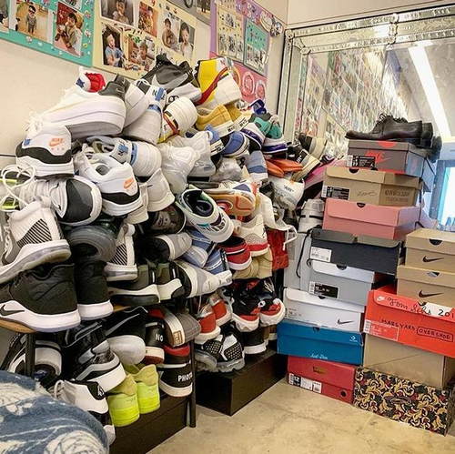 陈建州曝光家里某个角落的照片,只见10几个鞋盒高高叠起,各种品牌的运动鞋也一双一双往上堆叠,靠墙堆成一座小山,几乎都快挡到贴在墙上的飞飞翔翔照片。黑人自曝原本这些鞋子是放在门口,却因为害大家没地方走路,被范范警告“如果再不收,会让它们都消失”,他才想出这个方法,把鞋子往上叠起来,这样就有空间可以走路:“聪明吧?!”