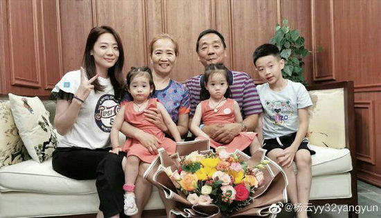 6月26日晚,杨云通过微博晒杨阳洋以及双胞胎女儿与父母合影,并为老爸庆生,写道:“祝爸爸生日快乐!”照片中,爷爷奶奶分别抱着欢欢和乐乐,两姐妹穿着同款连衣裙,扎着小辫,一个像妈