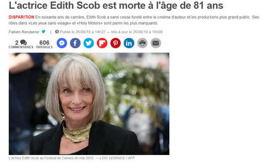 据外媒报道,法国老牌女演员爱迪丝·斯考博去世,享年81岁。法国时间26日中午,法国电影资料馆在社交账号上宣布了这个消息。