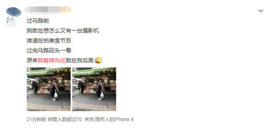 6月26日,有网友在社交平台晒出了偶遇郭碧婷向佐合体录节目的照片。该网友称:“过马路时,奇怪怎么会有摄像机,难道是在录美食节目?回头一看,原郭碧婷向佐就在我后面。”照片中,两人