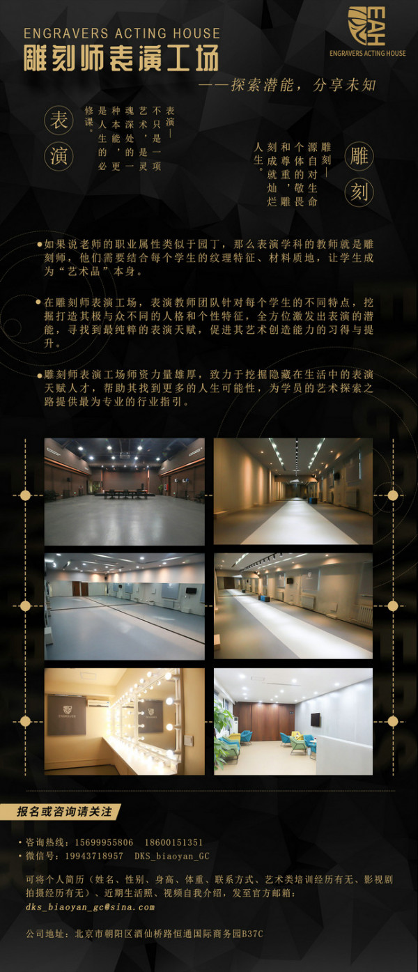 近日,由顶级艺术类表演教师团队倾力助阵的“雕刻师表演工场”即将在北京恒通国际商务园挂牌迎新,迎接在表演艺术上追求突破的追梦人。“雕刻师”致力于对求学者演技的打磨,学员表演美学认知的提升,力求通过共同精研表演这门人生的课程,使每一位对表演怀有赤诚之心的演员,都能开启表演道路上新的征程。