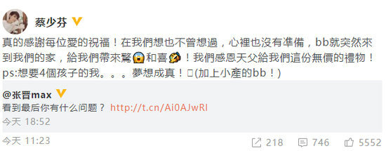 6月29日,蔡少芬发文感谢大家对于三胎宝宝的祝福,并表示:“我们想也不曾想过,心里也没有准备,bb就突然来到我们的家,给我们带来惊和喜!”她还称自己一直想要4个孩子,现在终于梦想成真了。