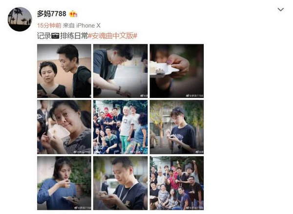 6月30日,孙莉在微博上晒出了一组排练话剧《安魂曲》中文版的组照,这也是她用镜头记录下自己排练的日常。最近一段时间,孙莉已然晒出了很多排练现场的照片。相比于此前黄磊在外拍戏工作,孙莉更多的则是晒出与多