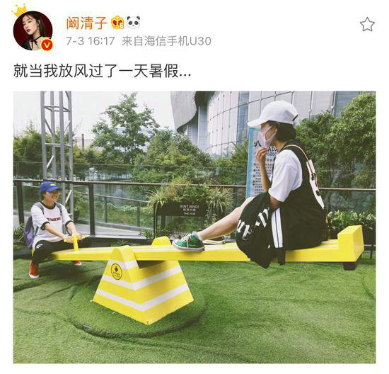 近日,演员阚清子在个人社交平台发布一张照片,图片中阚清子一身黑白运动休闲装,和好友各坐在黄色跷跷板的一边,而她则被另一端轻松地高高翘起,可见一直在剧组拍戏的阚清子瘦了许多。虽然面戴口罩看不见表情,但在配文中“就当放风过了一天暑假……”,看得出来阚清子的心情不错。此内容发布后,引得众网友纷纷调侃阚清子玩跷跷板只有三岁。据悉,阚清子正在紧密拍摄影视剧《信仰》,而由其主演的影视剧《惊蛰》预计在今年内会与大家见面。