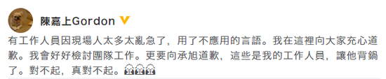 7月4日,导演陈嘉上在微博发文,针对言承旭菜市场拍片时,工作人员对围观人员喊“滚”一事道歉,他表示“有工作人员因现场人太多太乱急了,用了不应用的言语。我在这里向大家