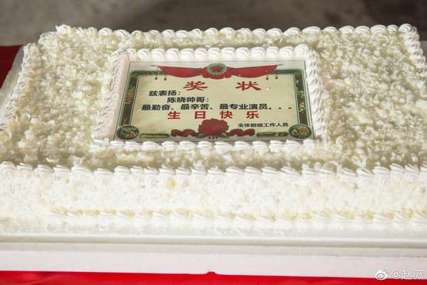 7月5日,赵薇在微博晒出了在其监制的新片片场为陈晓庆生的照片,并配文“生日快乐!《嗨!美男子》。”照片中,陈晓手捧向日葵,帅气十足。给陈晓准备的蛋糕上,写着“兹表扬