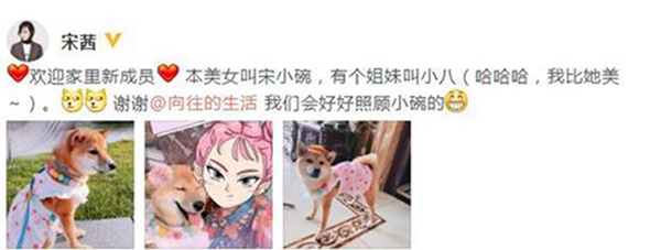 7月8日晚,宋茜晒新宠物,并俏皮的配文称:“欢迎家里新成员,本美女叫宋小碗,有个姐妹叫小八。谢谢@向往的生活 我们会好好照顾小碗的。”