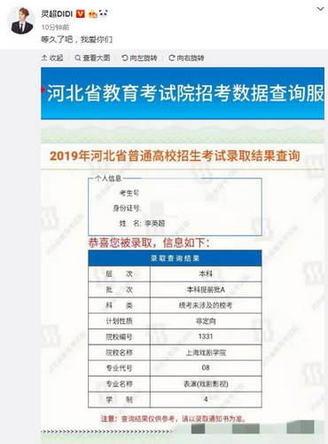 灵超被上戏表演专业录取 发文对粉丝表达感谢