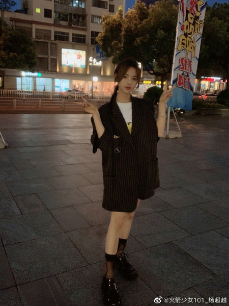 7月16日,火箭少女101成员杨超越在个人微博晒出一组韩系穿搭美照,并配文:“万能剪刀手。”照片中,杨超越套上黑色大码竖条西装外套比剪刀手,长腿纤细笔直,皮肤白皙透亮。