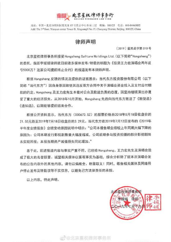北京星权律师事务所发布王力宏工作室律师声明7月19日,北京星权律师事务所发布王力宏工作室律师声明 。王力宏工作室则转发称:“接下来,王力宏会继续演《龙的传人2060世界巡回演唱会》,也会继