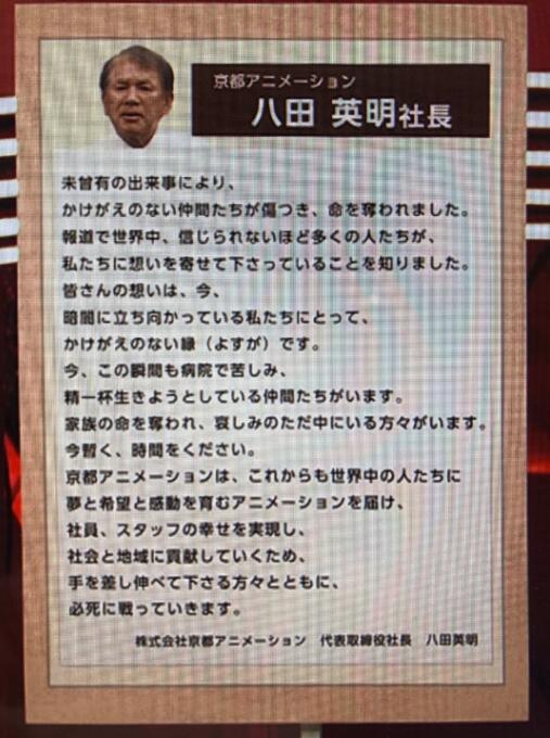 京都动画社长八田英明发声 致谢粉丝立誓奋战到底
