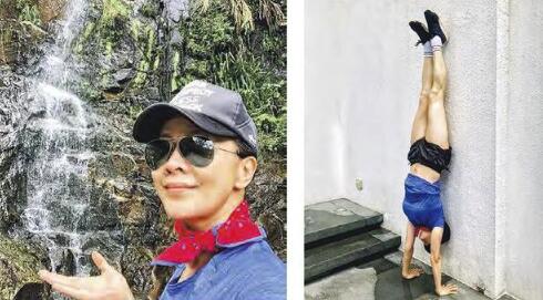 刘嘉玲昨天在社交平台分享行山照,以及做倒立的照片。