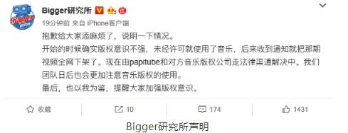 对此,@Bigger研究所今日在微博回应称,确实是版权意识不强,未经许可就使用了音乐,后来收到通知就把那期视频全网下架了。目前在由papitube和对方音乐版权公司走法律渠道解决中。