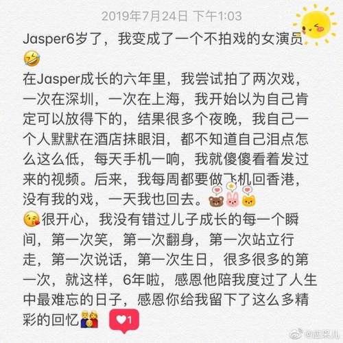 7月24日,应采儿还发文感叹:“Jasper 6岁了,我变成了一个不拍戏的女演员,在Jasper成长的六年里,我尝试拍了两次戏,一次在深圳、一次在上海,我开始以为自己肯定可以放得下的,结果很多个夜晚,我自己一个人默默在酒店抹眼泪,都不知道自己泪点怎么这么低,每天手机一响,我就傻傻看着发过来的视频。”