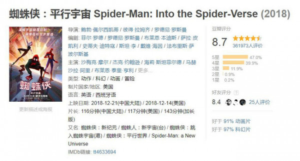 《蜘蛛侠:平行宇宙》豆瓣超高评分