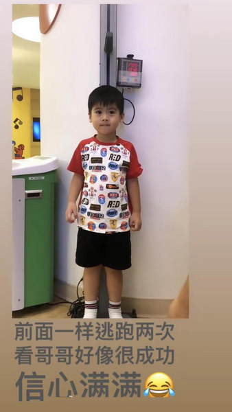 7月25日,林志颖娇妻陈若仪在个人社交平台上传了两则Kimi的双胞胎弟弟Jenson和kyson的量身高体重的视频。哥哥Jenson从测量仪上逃跑三次才乖乖站上去,测量的时候Jenson盯着妈妈,身体