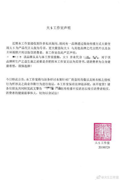 近日,有一品牌通过微商方式大量使用大S为产品代言人作为噱头营销,随后有消费者称在喝了由大S代言的某益生菌粉后拉肚子到脱虚。7月29日,大S工作室通过微博发表声明,称:“本工作室严正声明,大S并未代言某产品,请品牌妥善处理消费纠纷,关于盗用肖像等侵权行为本工作室与着作权拥有方已进行搜证,详细声明请参阅内文,特此公告,以正视听!”并表示工作室保有法律追诉权,绝不宽贷。稍晚,大S本人转发此声明,并提醒广大消费者不要上当受骗。
