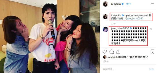 近日,林熙蕾在社交平台上晒出与好姐妹林心如和舒淇的聚会照,并配文称“近距离接触,我们都是小粉丝”,还不忘喊话萧敬腾。照片中,林心如穿着牛仔上衣双手捂着嘴巴,舒淇穿灰色上衣,双手交握放到嘴巴下,林熙蕾穿着玫红色上衣捂着脸,萧敬腾则站在中间穿着白色卡通T恤拿着话筒似乎在唱歌,三位女神全都盯着萧敬腾表情十分崇拜化身小迷妹。萧敬腾本人也随后在评论中搞怪回复了一堆草莓图案,并调侃有没有人要买草莓吗?