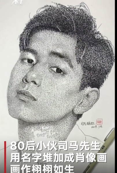 吉林长春80后小伙司氏砸缸手写近万个名字拼加成肖像画,画成的李现跃然纸上。这位小伙称,用名字堆加成肖像画的灵感来源于点画法。由于每个名字需重复书写近万遍,他常常感到枯燥且坐不住,要“画吐了
