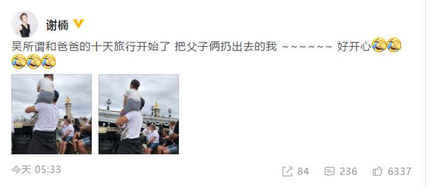 8月6日早晨,谢楠在社交平台上分享丈夫吴京和儿子吴所谓共同出游的照片,并配文写道:“吴所谓和爸爸的十天旅行开始了,把父子俩扔出去的我~~~~~~好开心。”照片里吴所谓穿着白色T恤,灰色裤子坐在爸爸肩上,超级有爱。