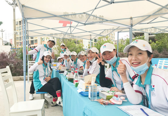 “为有牺牲多壮志,敢教日月换新天”,在这里,无形的氛围感染,韩红爱心团队愈发凝结与坚韧。在革命先烈的无声鼓舞下,全体志愿者不忘初心,砥砺前行,誓将“百人援川”公益活动圆满完成。瞻仰完毕之后,志愿者队伍又紧急出发,赶往义诊第一站——通江县至诚中心卫生院。车手志愿者、医生志愿者、明星志愿者等齐心协力,有条不紊地完成各自工作,搭建帐篷、病人引导、义诊等。作为团队新人,张歆艺主要负责重症患者地后续治疗登记工作。在志愿者的带领下,她逐渐适应这种工作节奏。而作为老队员,陈明、金池、谭维维负责在药房分发药物;王铮亮、吉杰主要负责引导病人等。他们的工作也愈发熟练。