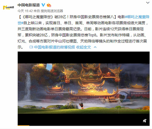 《哪吒》票房破28亿 位列中国影史票房总榜第八