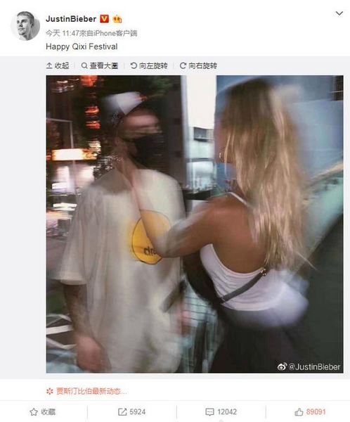 比伯7日在微博上传一张与超模老婆海莉的合照,照片中,两人身穿同色系上衣,虽然画面模糊,但看得出来打情骂俏的两人感情甜蜜。他也配图写道:“七夕情人节快乐。”短短一句话和随兴照,再次让粉丝激动不已。