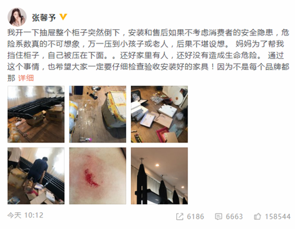 8月8日,张馨予在微博上发文称:“我开一下抽屉整个柜子突然倒下,安装和售后如果不考虑消费者的安全隐患,危险系数真的不可想象,万一压到小孩子或老人,后果不堪设想。妈妈为了帮我挡住柜子,自己被