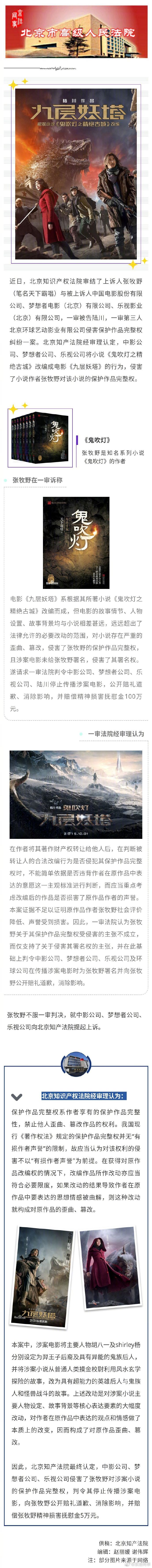 中新网客户端8月10日电(记者 宋宇晟) 持续近4年的电影《九层妖塔》侵权案有了结果。据北京法院网官方微博消息,二审判决认定,片方将小说《鬼吹灯之精绝古城》改编成电影《九层妖塔》的行为,侵害了小说作者张牧野(笔名天下霸唱)对该小说的保护作品完整权,判令其停止传播涉案电影,公开赔礼道歉、消除影响,并赔偿张牧野精神损害抚慰金5万元。而2016年时,该案一审法院认为,片方并未侵犯作者保护作品完整权,只认定电影侵犯张牧野署名权。
