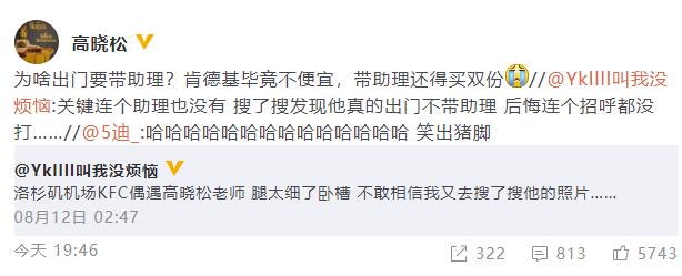 8月12日晚,高晓松发博幽默回应网友调侃,称:“为啥出门要带助理?肯德基毕竟不便宜,带助理还得买双份。”据悉,12日凌晨,有网友在洛杉矶机场偶遇高晓松,但因为高晓松腿太瘦且身旁