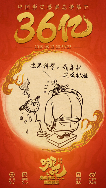 千万观众的助力与支持,使得影片《哪吒之魔童降世》不仅打破由《疯狂动物城》保持三年的15.3亿动画电影票房纪录,更以破36亿的好成绩,位列影史票房总榜Top5。面对观众一路以来的支持与喜爱,导演饺子通过手绘破亿海报的方式表示着感谢。目前,导演饺子18天共绘制36幅破亿海报,每幅破亿海报都以“小剧场”的形式对影片内容进行二次扩展,富含心意。导演直言表示,影片现在取得的成绩,是当初完全没有想到的,非常感恩观众对于哪吒的包容与喜爱。上映以来收获这么多的溢美之词,是压力也是动力,会“全力以赴”制作下一部更好的作品回馈观众。
