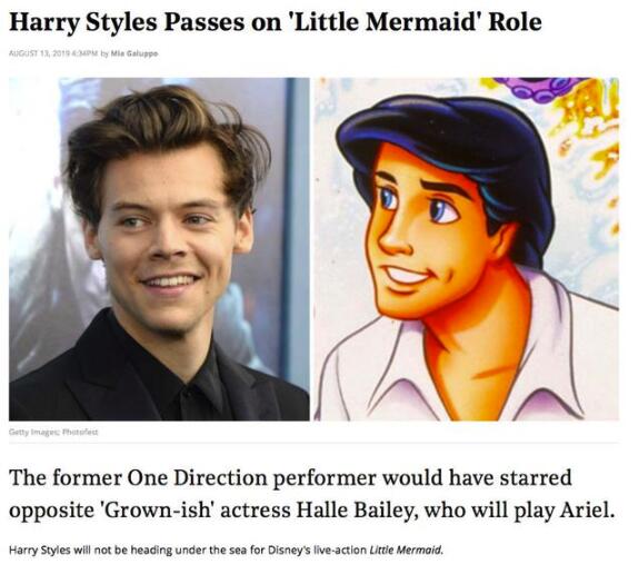 8月14日,据外媒报道,哈里·斯泰尔斯和迪士尼之间的协商结束,不会参演真人版《小美人鱼》,新的选角工作即将开始。此前有传哈里·斯泰尔斯已签约,将在《小美人鱼》中扮演亚力克王