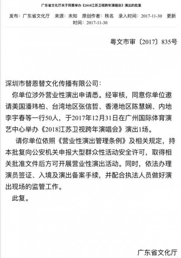 近日,广东省文化厅同意江苏卫视跨年晚会演出的批复曝光,上面显示李宇春、张信哲、陈慧娴、潘玮柏等歌手加盟。今日,江苏卫视公布张信哲,陈慧娴,李宗盛,周华健等大咖的加入。不少粉丝对此阵容表示期待:“太棒了,春春可以和潘玮柏同台hiphop。”